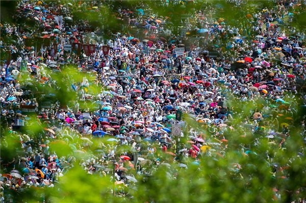 A csíksomlyói búcsún tartott szentmise résztvevői a Kis- és Nagysomlyó-hegy közötti nyeregben 2017. június 3-án. (MTI Fotó: Balogh Zoltán)