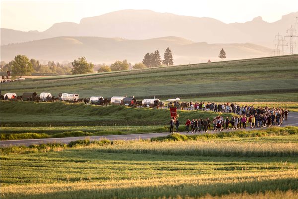 A csíksomlyói búcsúra tartó csíkszentdomokosi keresztalja gyalogos zarándoklata Csíkmadaras határában 2017. június 3-án reggel. (MTI Fotó: Veres Nándor)